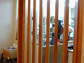 格子の目隠し。客席からは中の様子はほとんど見えません。が、厨房からは、お客様の出入りの様子がよく見えます。この角度、厨房に立って、客席に立って、微妙な角度を調整しながら決めました。木の温かみが伝わってきます。
